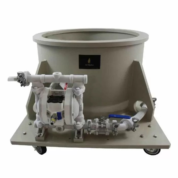 This is a Polypropylene molded plastic filter trolley. This machine is tough, durable, and almost indestructible. PP is impervious to Nitric, Hydrochloric, and similar acids or bases and easily handles Ethanol, Isopropyl, and most other solvents. Our trolley comes with an included diaphragm pump which does the job of active vacuum to filter through the filter paper; no vacuum pump is required. This is a pneumatic pump so there is no risk of sparks. An air compressor is required to supply this machine with compressed air. To operate we place filter paper over a removable grate, then place a seal around the filter paper to prevent leaks. This takes a few minutes to install and even faster to take apart. Add your tincture and begin filtering.