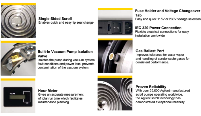 Agilent IDP dry scroll pumps are oil-free, compact, quiet, high performance vacuum pumps. IDP pumps use a single-sided scroll design that allows for a straightforward 15 minute maintenance procedure with simple tools. Large pumping speeds and compact sizes are ideal for many applications in the research, analytical instrument, and laboratory markets.