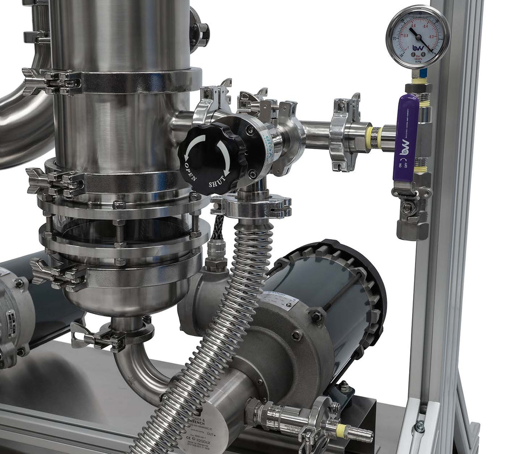 We paired our FFE with reliable equipment that will keep operations running. End users are required to plumb the process inlet and outlet connections for both heat exchangers. They are supplied with 1.5” sanitary tri-clamp connections. BVV™ can assist with necessary parts needed for a permanent or temporary installation. Temporary installations may be necessary if your lab has limited fume hoods or space which is shared with other processing equipment.