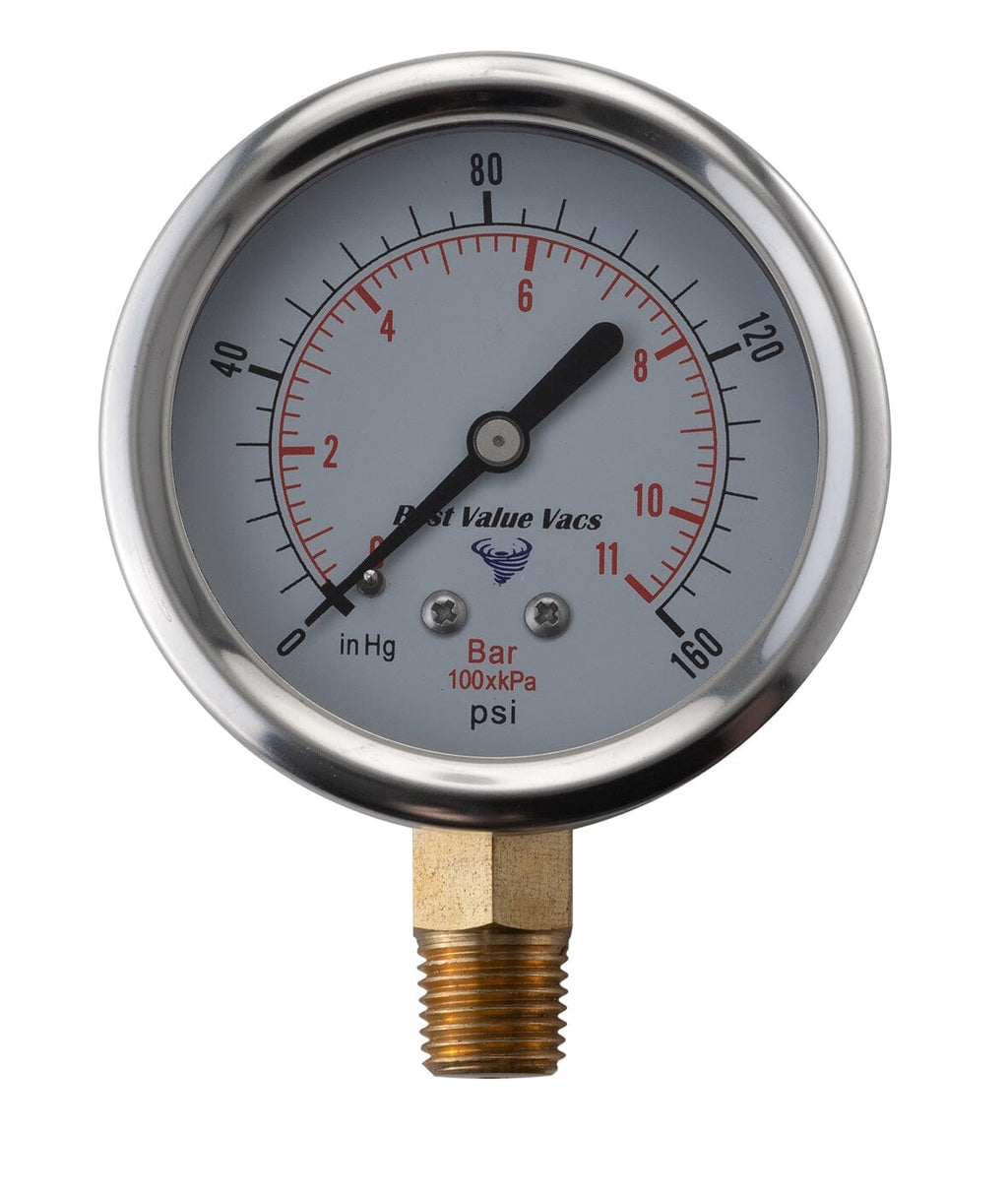 The Oil Filled Vacuum/Pressure Gauges have internal parts that are permanently lubricated to assist in smooth movement and fine tuning of the needle. All models are bottom mount with a 1/4" MNPT brass connection. All positive pressure is measured in both PSI and Bar. Negative pressure is measured in inHg and Bar.