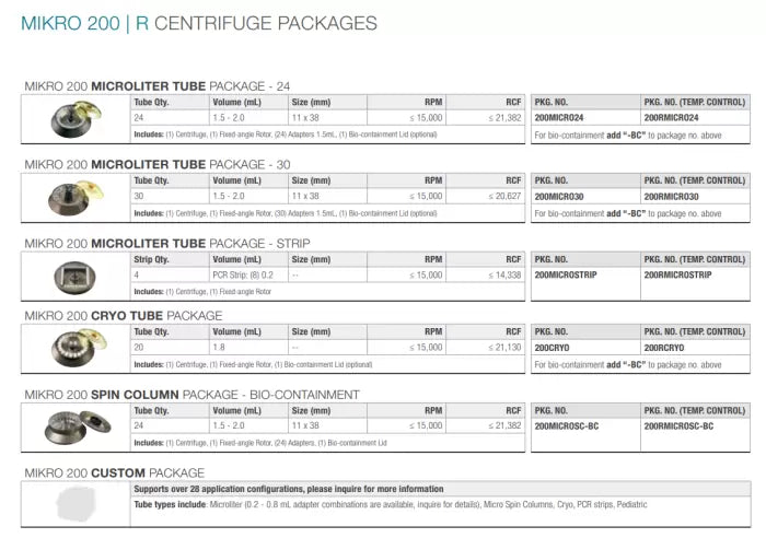 - Rotor variety for a multi-functional work-flow. For both pediatric tubes and standard microliter tubes, users have the option of a 24-place or 30-place angle rotors. The MIKRO 200 also offer a 4-place PCR strip rotor and 20-place cryo tube rotor for even greater versatility. An 18-place rotor for spin column kits is designed to protect the tube cap from breaking during centrifugation and is also available with autoclavable, phenol resistant, bio-containment lid.